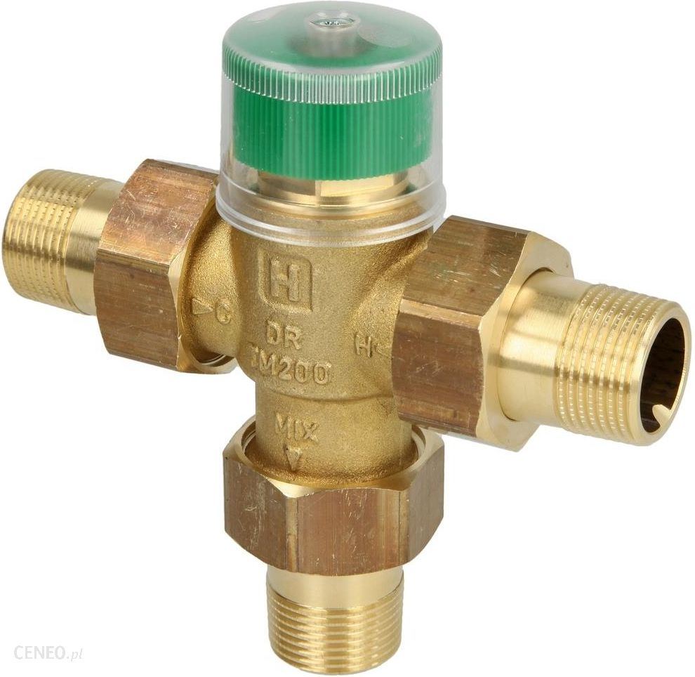 Termostatyczny zawór mieszający TM200 reguluje temperaturę wody i ma zastosowanie: w centralnej regulacji zasilania ciepłej wody użytkowej lub bezpośrednio przy odbiornikach, albo dla podgrzewania wody z wykorzystaniem energii słonecznej w ukladzie z dwoma źródłami energii, w systemach grzewczych z ogrzewaniem podłogowym lub do ograniczania temperatury powrotu do kotła. W miejscach, w których system zasilania wody zawiera obieg cyrkulacyjny gorącej wody, należy zamontować zawór zwrotny KB 191 (patrz akcesoria), który pozwala uniknąć cofania się zimnej wody i chłodzenia wymieszanej wody na odbiorze. Medium:woda Materiał korpusu:mosiądz Maks. temp. medium:90 oC zakres nastawy temperatury:30 … 60 oC Dodatkowy opis element termiczny o wysokiej czułości na temperaturę otaczającej go wody, nawet przy małych przepływach, prosty sposób nastawy wartości temperatury zabezpieczenie przed poparzeniem – wejście gorącej wody jest automatycznie odciinane, gdy zostanie przerwany dopływ zimnej wody pod warunkiem, że temperatura na wejściu gorącej wody jest co najmniej 10 K większa niż temperatura wody zmieszanej, wejście zimnej wody jest automatycznie odcinane, przy przerwaniu dopływu wody gorącej wewnętrzne elementy zaworu wykonane z materiałów odpornych na osadzanie się kamienia Przykłady zastosowania: